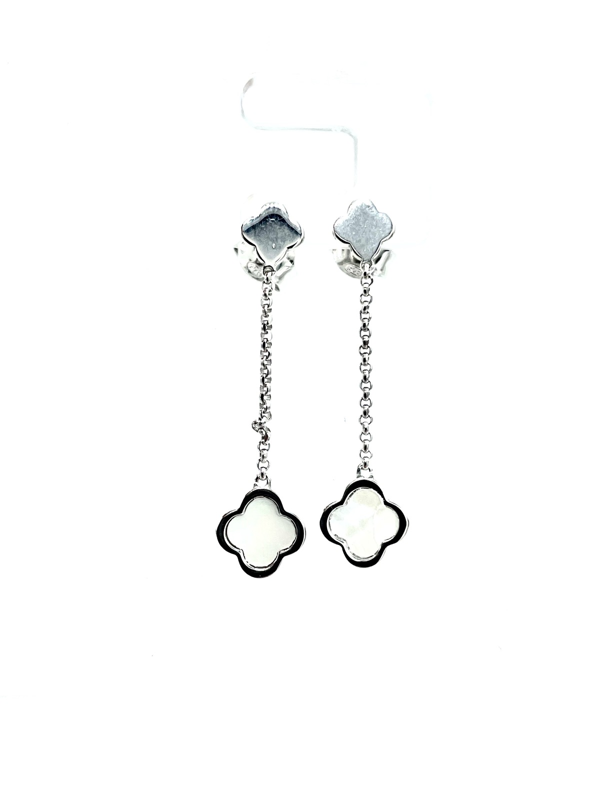 Long earrings in silver tit. 925m. with mother of pearl flowers.