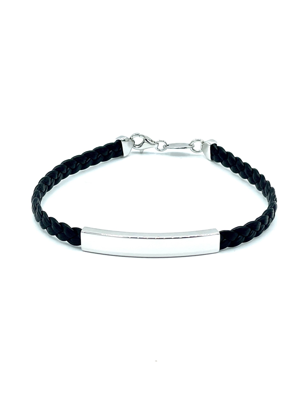 Bracciale uomo con pelle intrecciata e targa in argento tit. 925m.