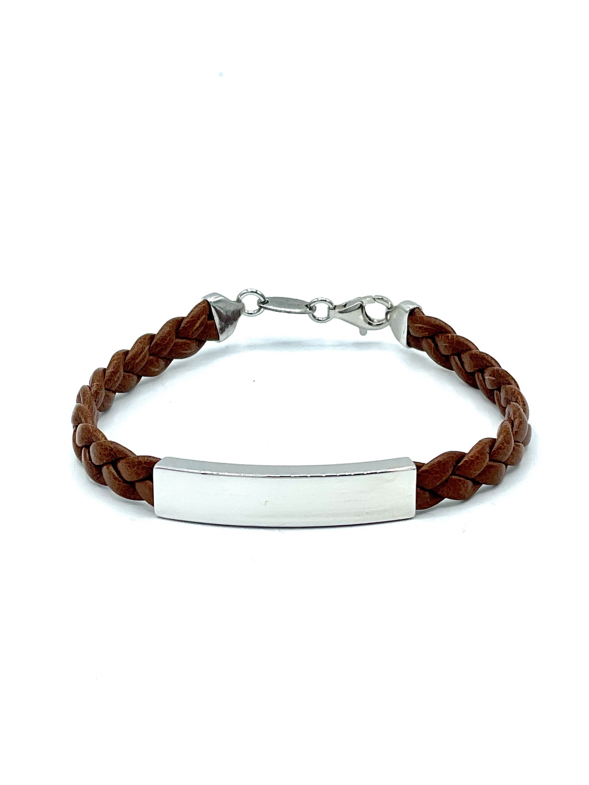 Bracciale uomo di pelle intrecciata con targa in argento tit. 925m.