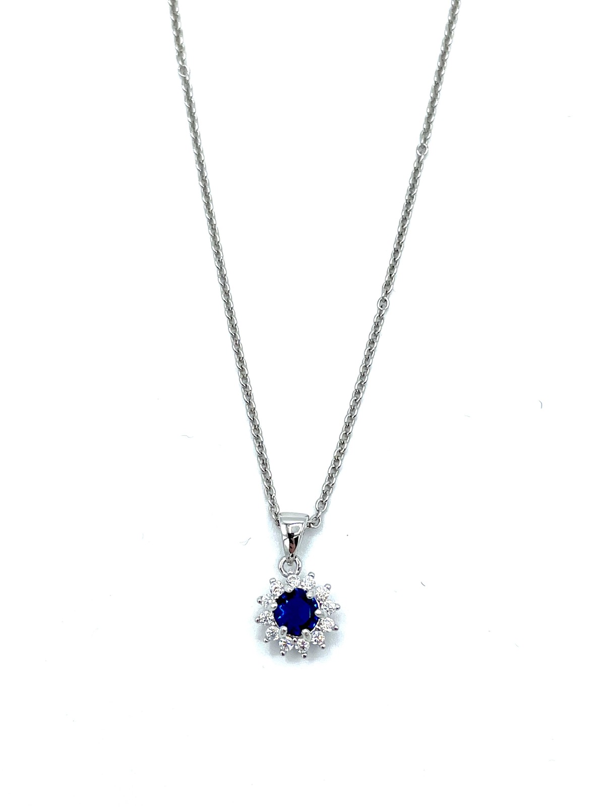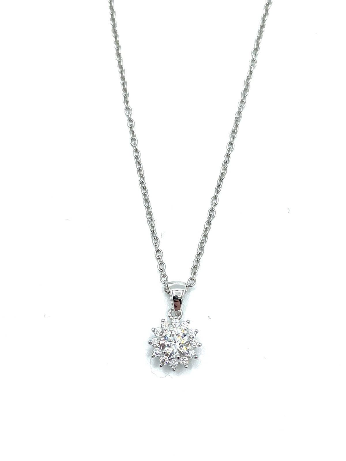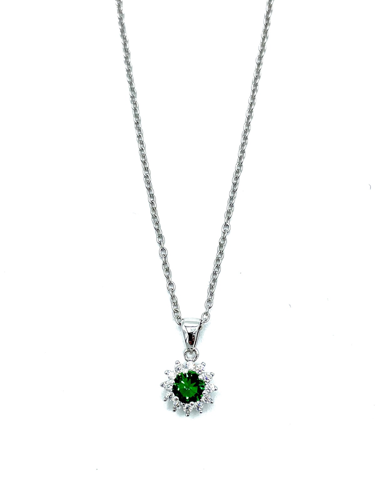 Collana in argento tit. 925m. con pietra tonda centrale contornata da zirconi.