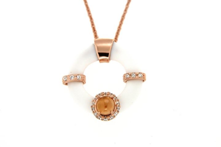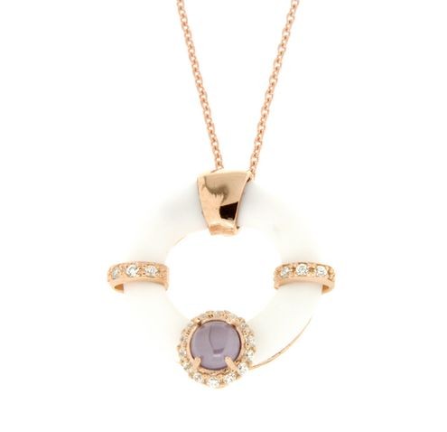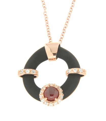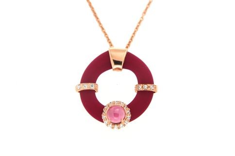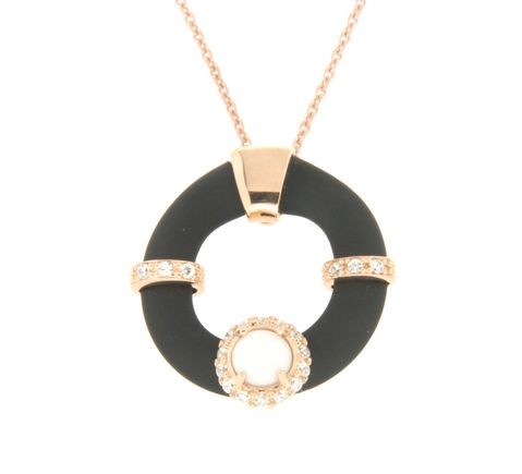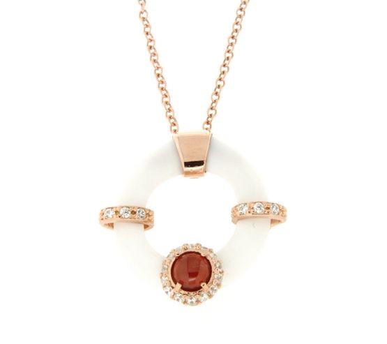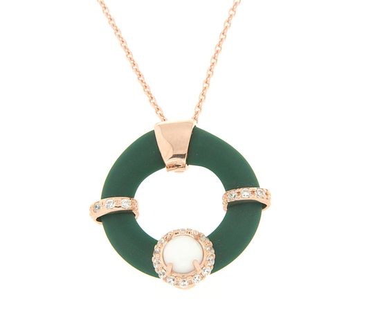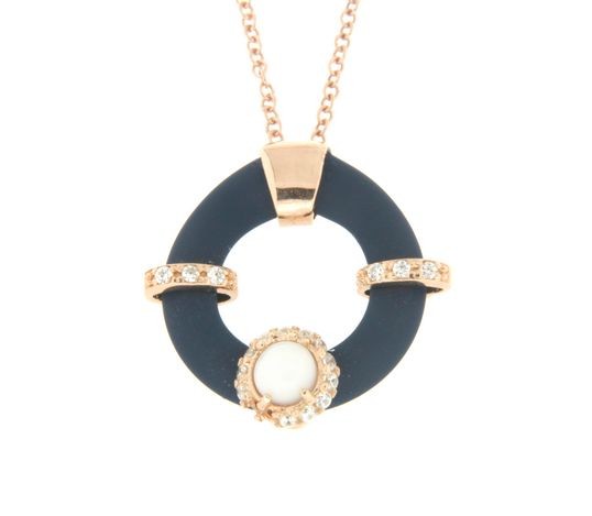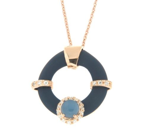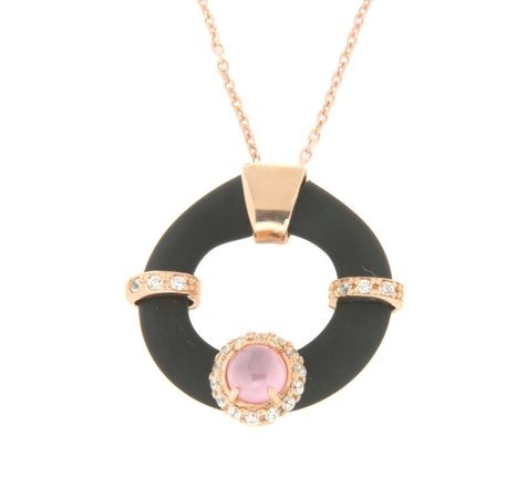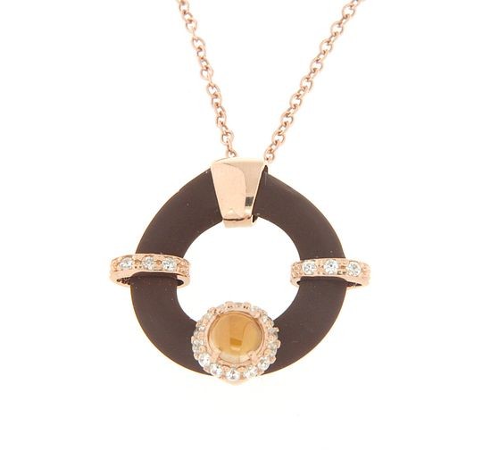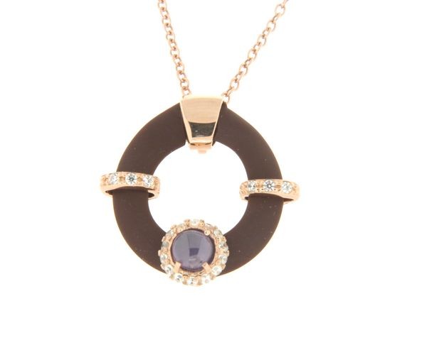 Collana in argento tit. 925m. con ciondolo in caucciù con fiorellino contornato da zirconi e pietra centrale colorata.